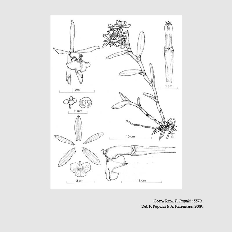 TYPE: Costa Rica. Limón: Sixaola, Valle del Río Estrella, Bocuare, near sea level, collected by Ana Cecilia Fonseca, March 2004, flowered in cultivation and exhibited at the XXXIV National Orchid Show in San José, 16 March 2005, F. Pupulin 5570 (holotype, USJ; illustration of type; photo of the flower from the plant that served as the holotype).