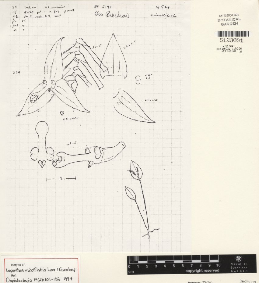 TYPE: Colombia. Dept. of Antioquia: Munic. of La Ceja, Río Piedras, alt. 2400 m, collected by D. Arbeláez et al., 1990, flowered in cultivation at Colomborquídeas, 2 Jan. 1993, R. Escobar 5191 (holotype, JAUM; isotype, MO, C. Luer illustr. 16564; illustration of type).