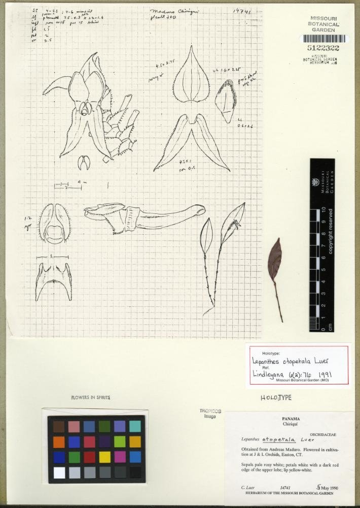 TYPE: Panama. Chiriquí, collected by A. Maduro, without locality, flowered in cultivation by J & L Orchids, Easton, CT, May 1990, C. Luer 14741 (holotype, MO; illustration of type).
