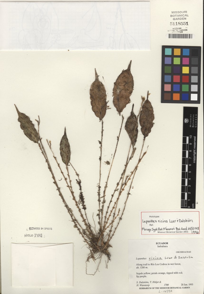 Lepanthes ricina Luer, Monogr. Syst. Bot. Missouri Bot. Gard. 61(3): 148–149, f. 204. 1996.