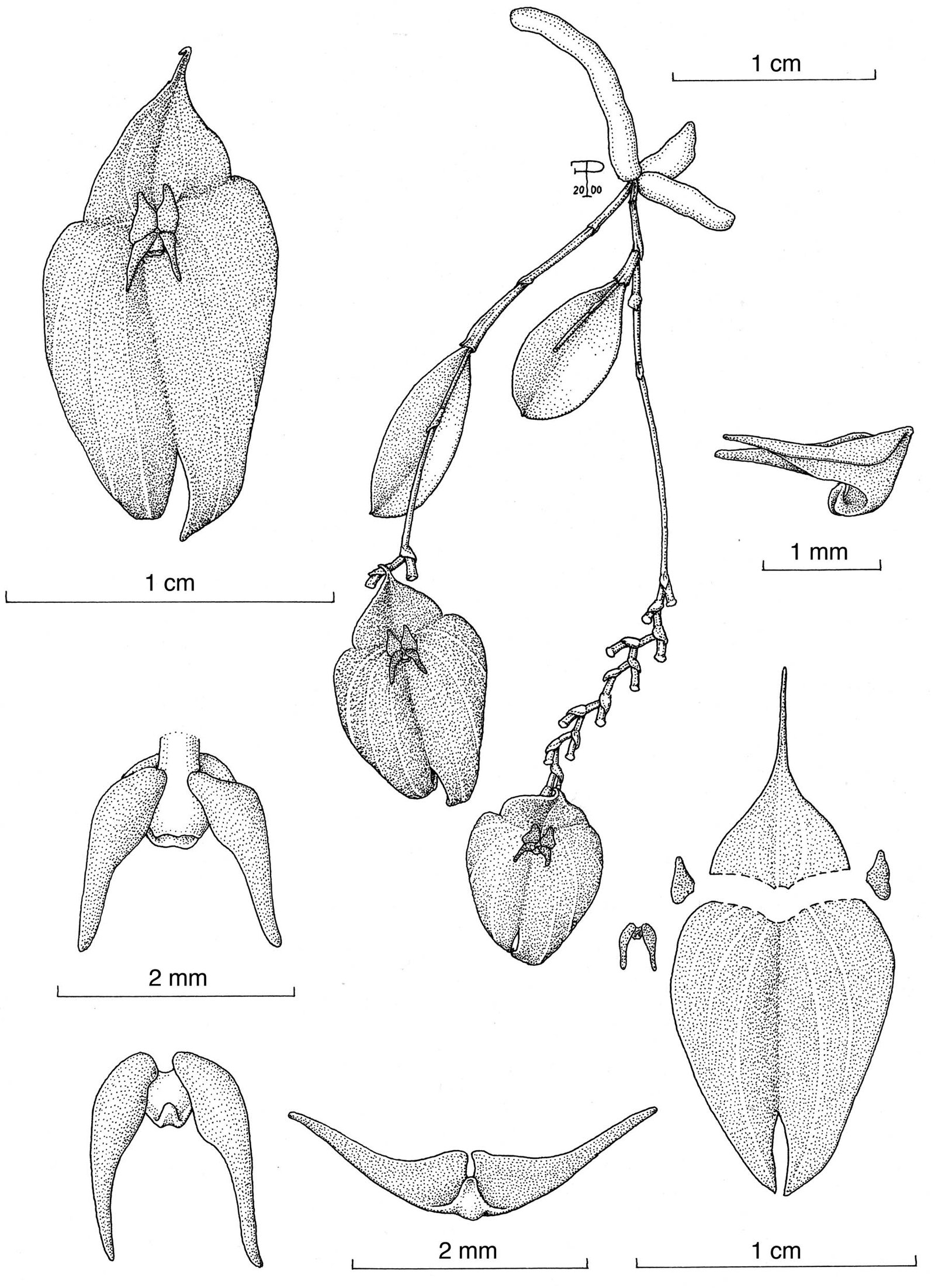 TYPE: Costa Rica. Cartago: Orosi, road to the Tapantí National Park, about 1 km before the entrance of the park, 1160 m, epiphytic on a short tree along the roadside, 6 Feb. 2000, F. Pupulin 1979 [holotype, USJ, apparently lost (illustration of type; photo of the flowers from the plant that served as the holotype); neotype, designated by Pupulin & Bogarín (2012): Costa Rica. Cartago: Orosi, Tapantí, Purisil, road to Tapantí National Park, between restaurant Kirí and the entrance of the Park, about 1 km before the entrance, 9°45'50.4"N 83°47'24.4"W, 1245 m, epiphytic on short fence trees along the roadside, premontane wet forest, 20 August 2007, F. Pupulin 6859, M. Pupulin & C. Pupulin (CR; photo of the plant in situ)].