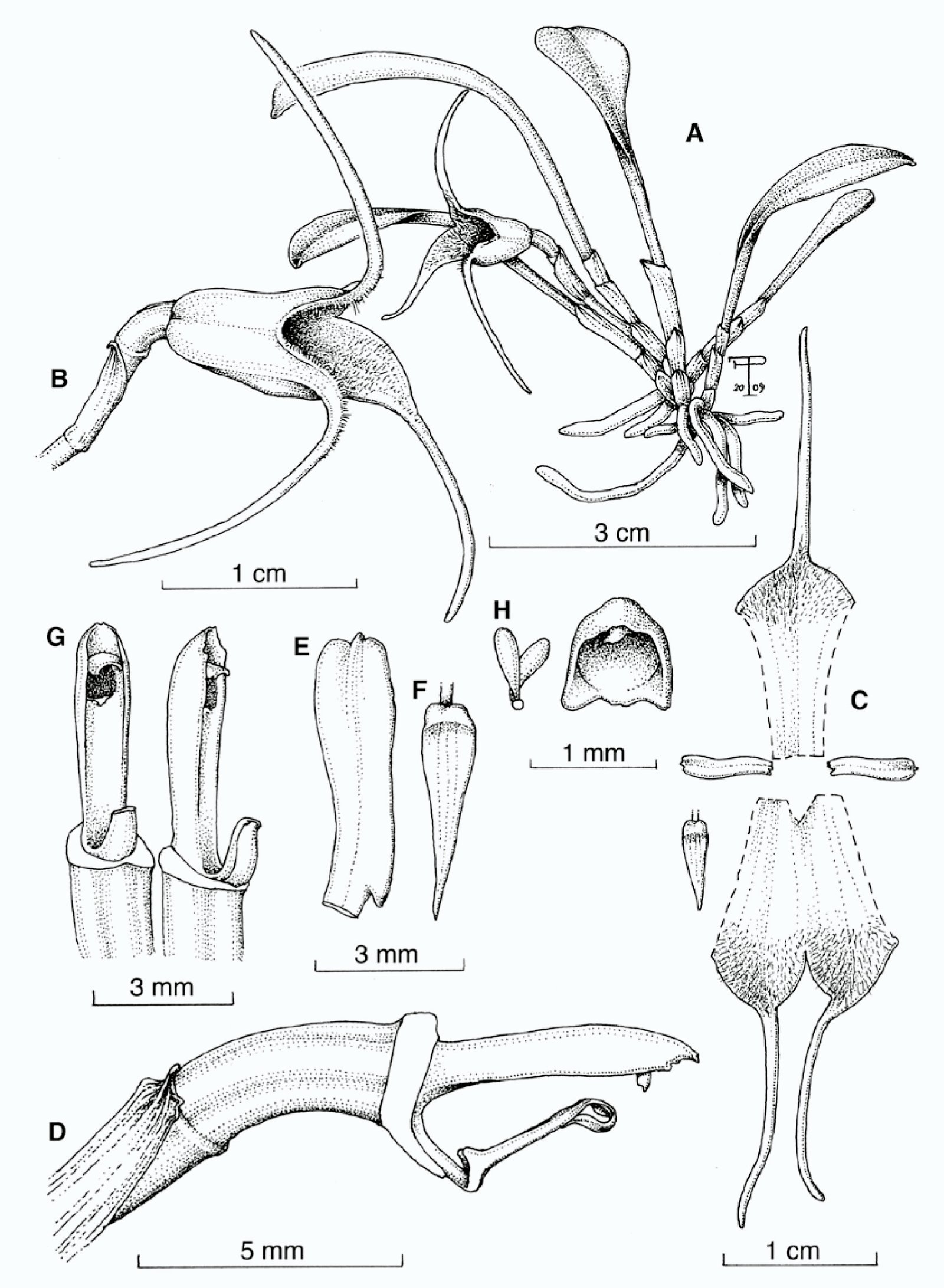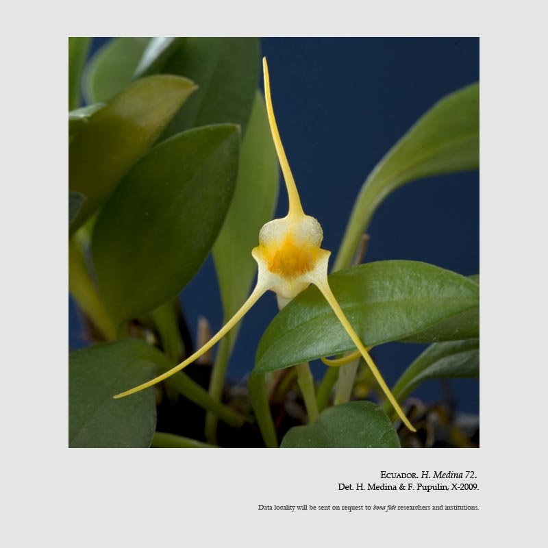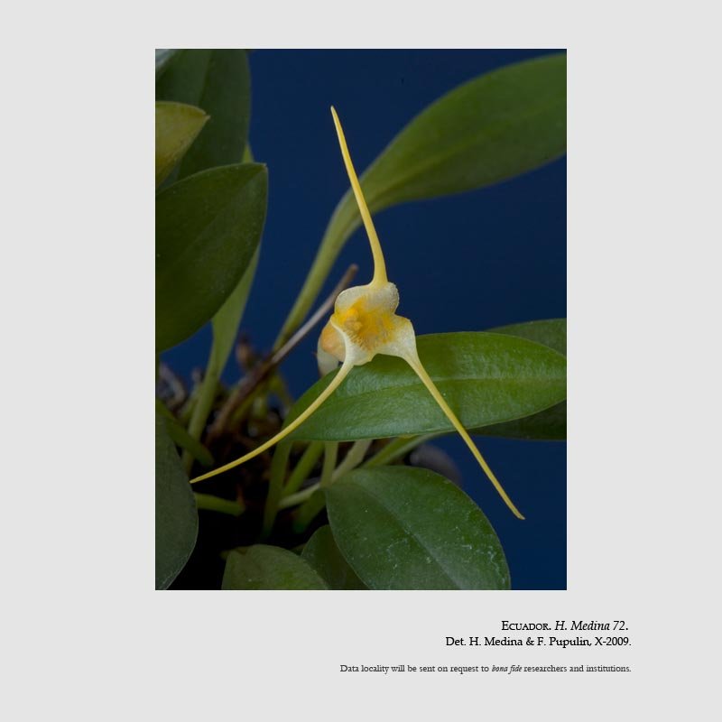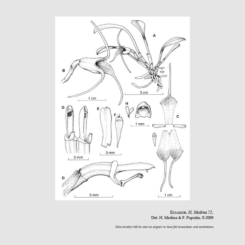 TYPE: Ecuador. Zamora-Chinchipe: near The Tambo, 1800 m, Nov. 1993, flowered in cultivation in the collection of Ecuagenera at Gualaceo, accesión No. 002293, 14 Oct. 2009, H. Medina 72 (holotype, QCNE; illustration of type; photo of the flower from the plant that served as the holotype).