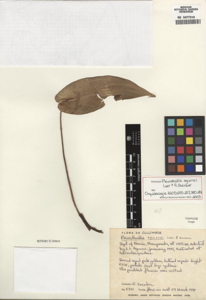 Pleurothallis aguirrei Luer & R. Escobar, Orquideología 22(3): 255-257, 280-281. 2003.