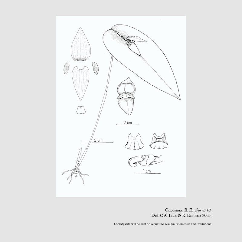 TYPE: Colombia. Nariño: Monopamba, alt. de 1500 m, recolectada por J.L. Aguirre, enero de 1993, cultivada en la empresa Colomborquídeas, 27 de marzo de 1997, R. Escobar 8310 (holotype, MO; illustration of type).