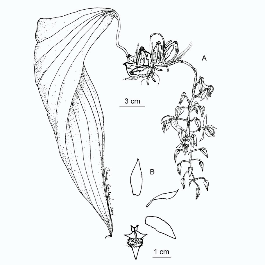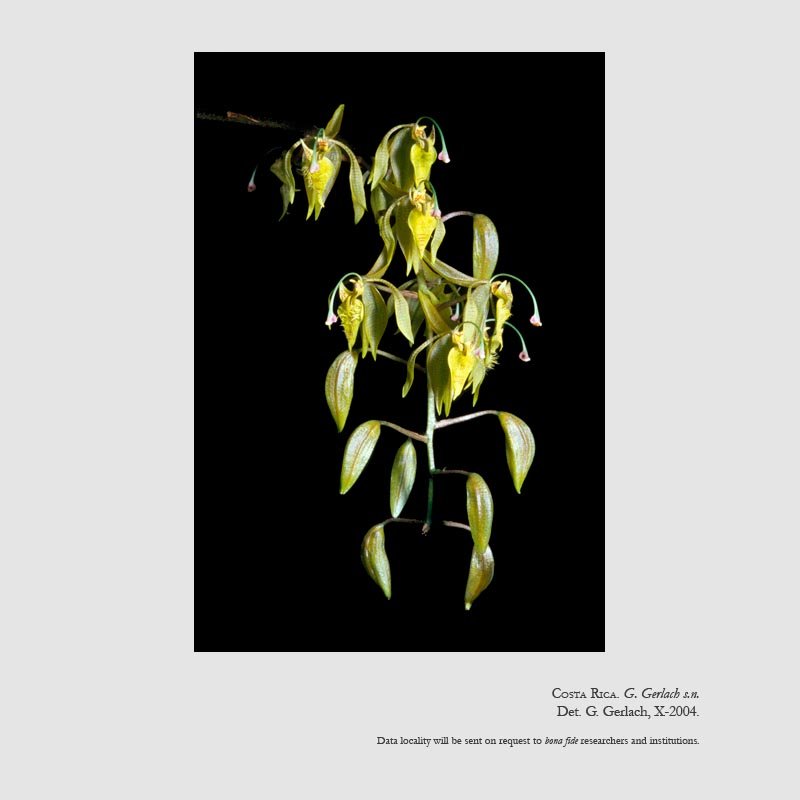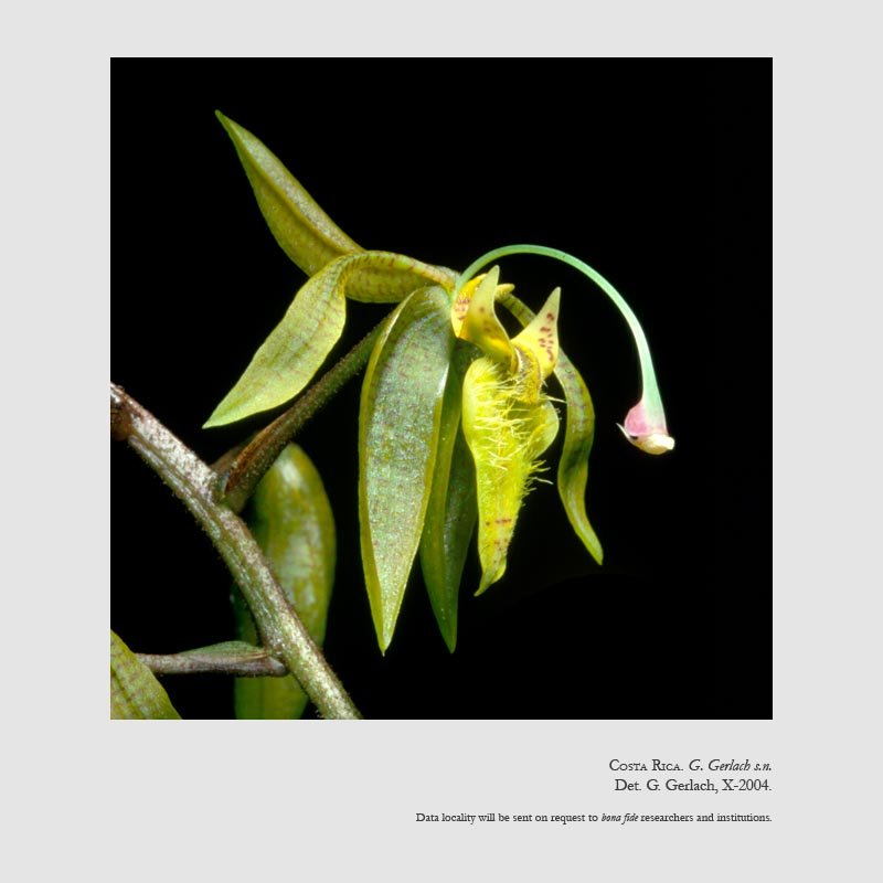 TYPE: Costa Rica: Fila Costeña a lo largo de la división territorial entre las provincias San José y Puntarenas: Refugio de Vida Silvestre Boracayán, aprox. 10 km al este de Dominical, cerca de la Catarata de San Luis, a lo largo de la Fila Tinamastes, 09º14'57"N, 83º45'01"W, 1008 m., 30 May 2003, floreció en invernadero del Jardín Botánico de Múnich-Nymphenburg, Alemania, Oct 2003, bajo el número 03/2628, M. Blanco, F. Pupulin, H. León-Páez & G. Gerlach s.n. (holotype, USJ; illustration of type).