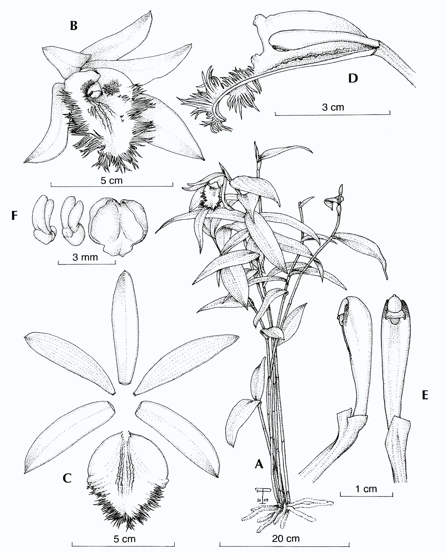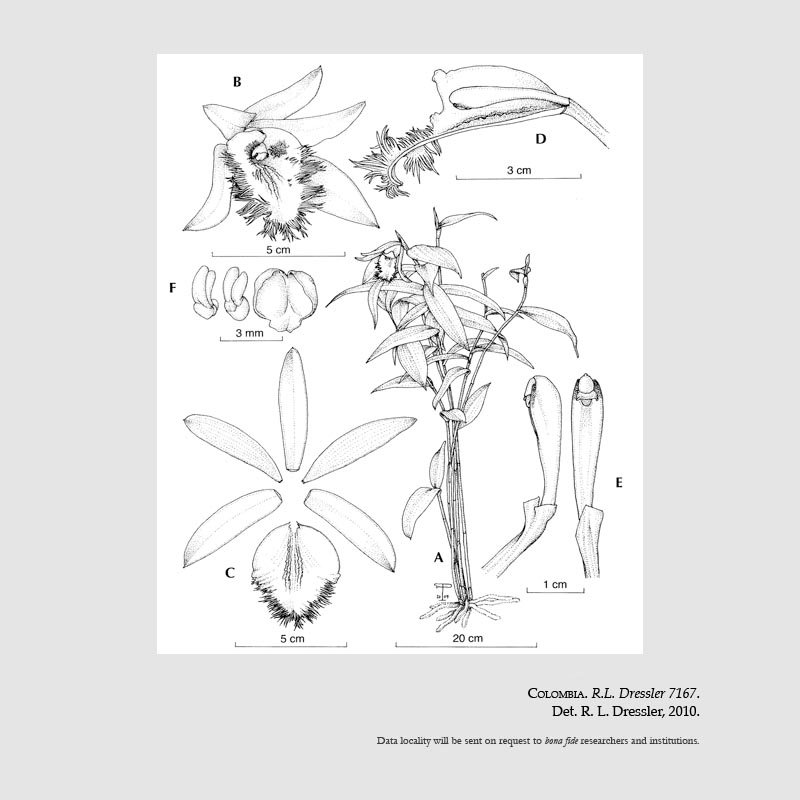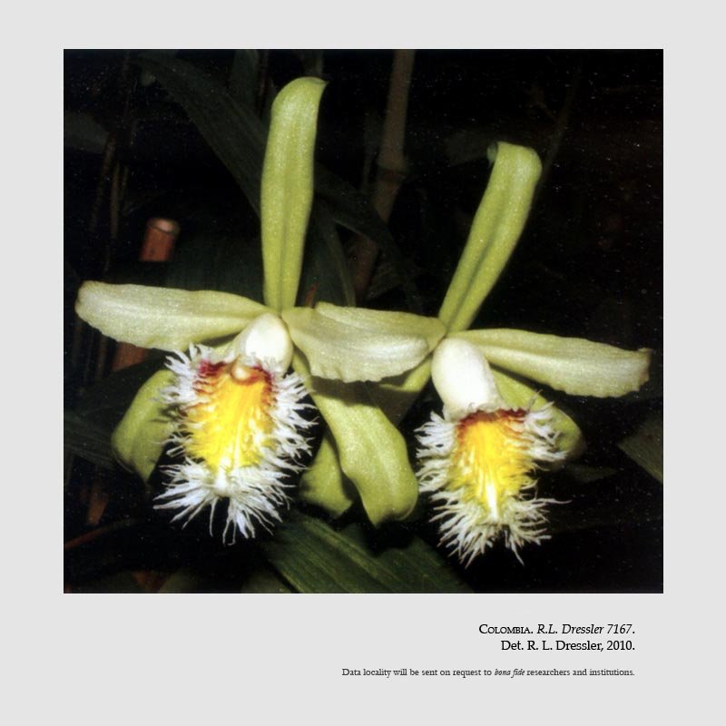 TYPE: Colombia. Cultivada en el Jardín Botánico Lankester, No. de acceso 18484, floreció en cultivo el 30 julio 2009, R.L. Dressler 7167 (holotype, CR; isotype, JBL; illustration of type; photo of the flowers from the plant that served as the holotype).