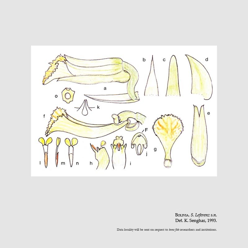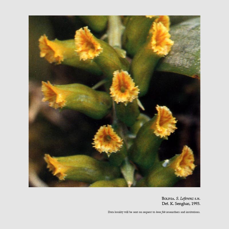 TYPE: Bolivia. Dptm. La Paz: near Yolosa, ca. 1000 m, Bot. Garden Heidelberg 0-20061, P. Leferenz s.n. (holotype, HEID; photo of the inflorescence from the plant that served as the holotype; illustration of type).