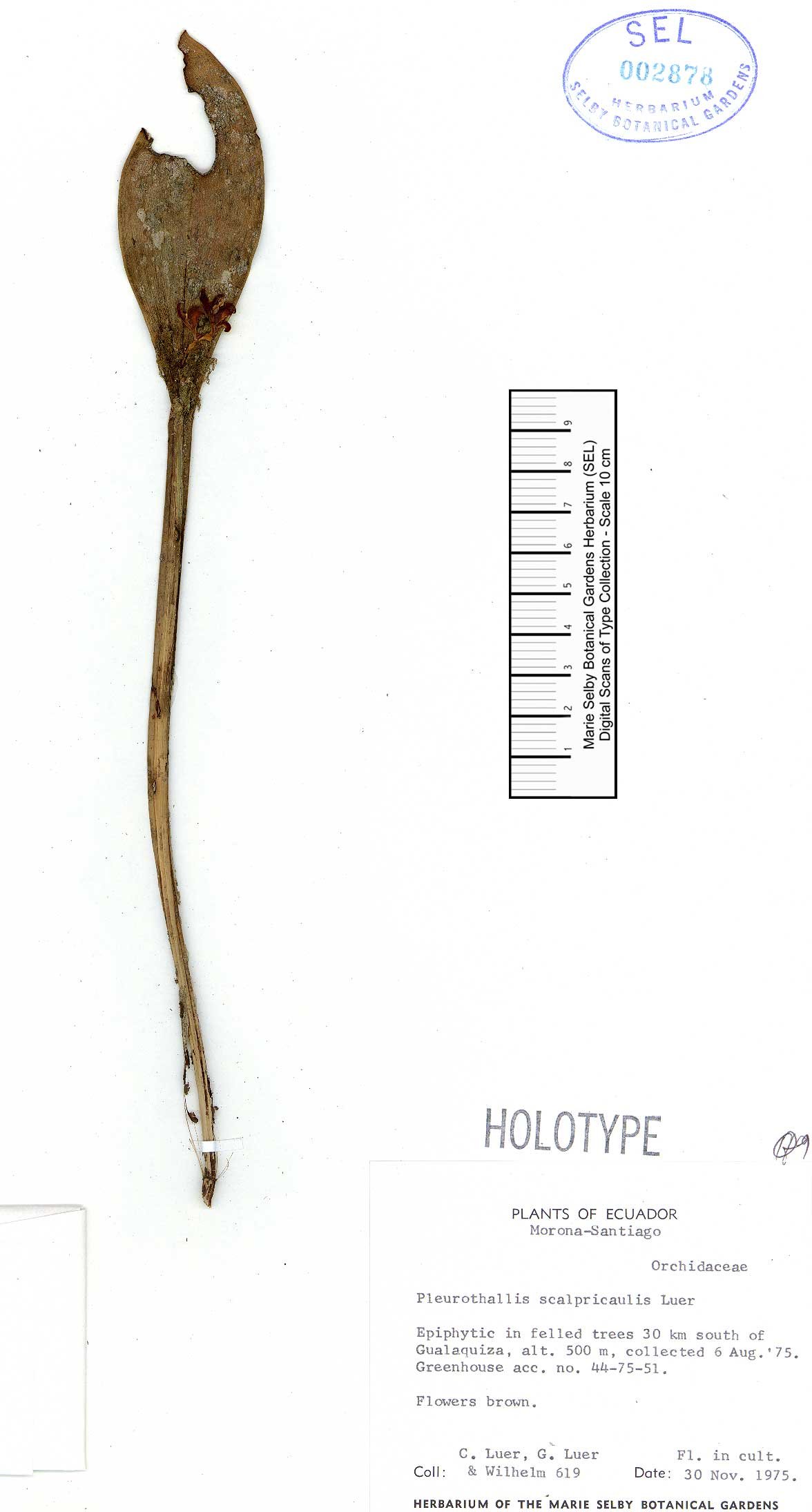 TYPE: Ecuador. Morona-Santiago: epiphytic about 30 km south of Gualaquiza, alt. 500 m, 6 Aug. 1975, flowered in cult. 30 Nov. 1975, C. A. Luer, G. M. Luer, & S. Wilhelm 619 (holotype, MO; illustration of type).