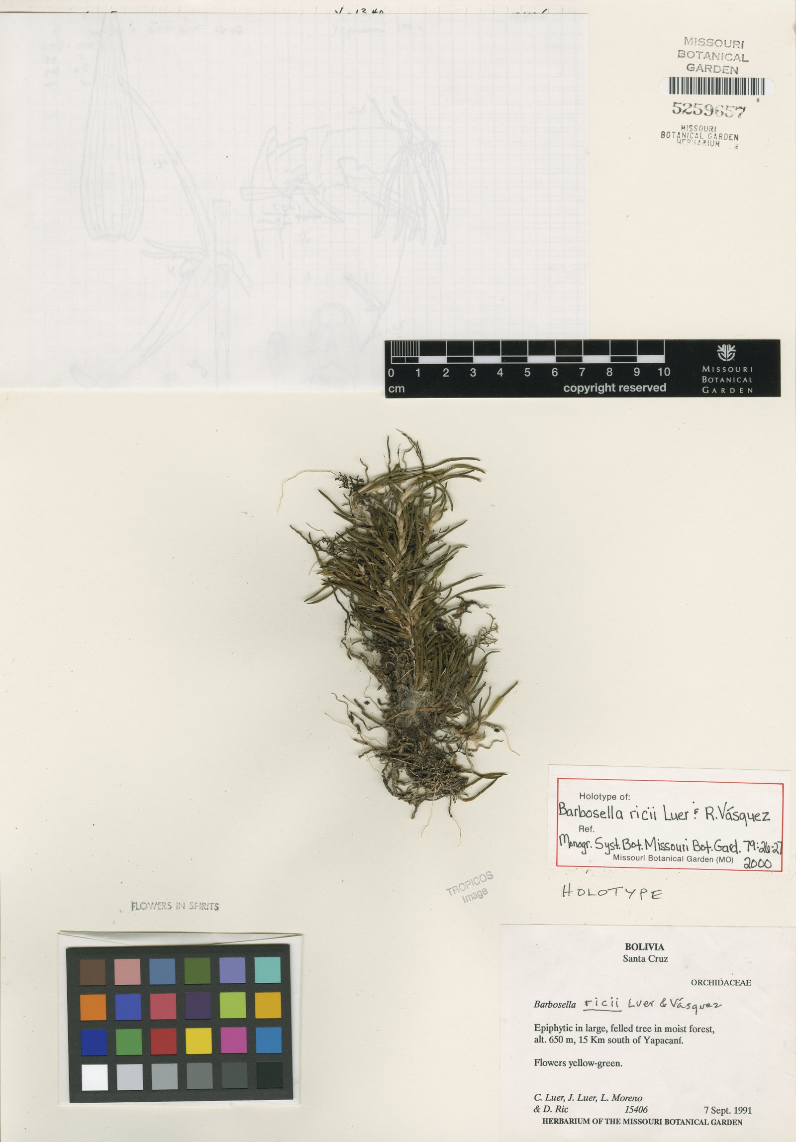 TYPE: Bolivia. Santa Cruz: epiphytic in moist forest sough of Yapacani, alt. 600 m, 7 Sept 1991, C. Luer, J. Luer, L. Moreno & D. Ric 15406 (holotype, MO; illustration of type).