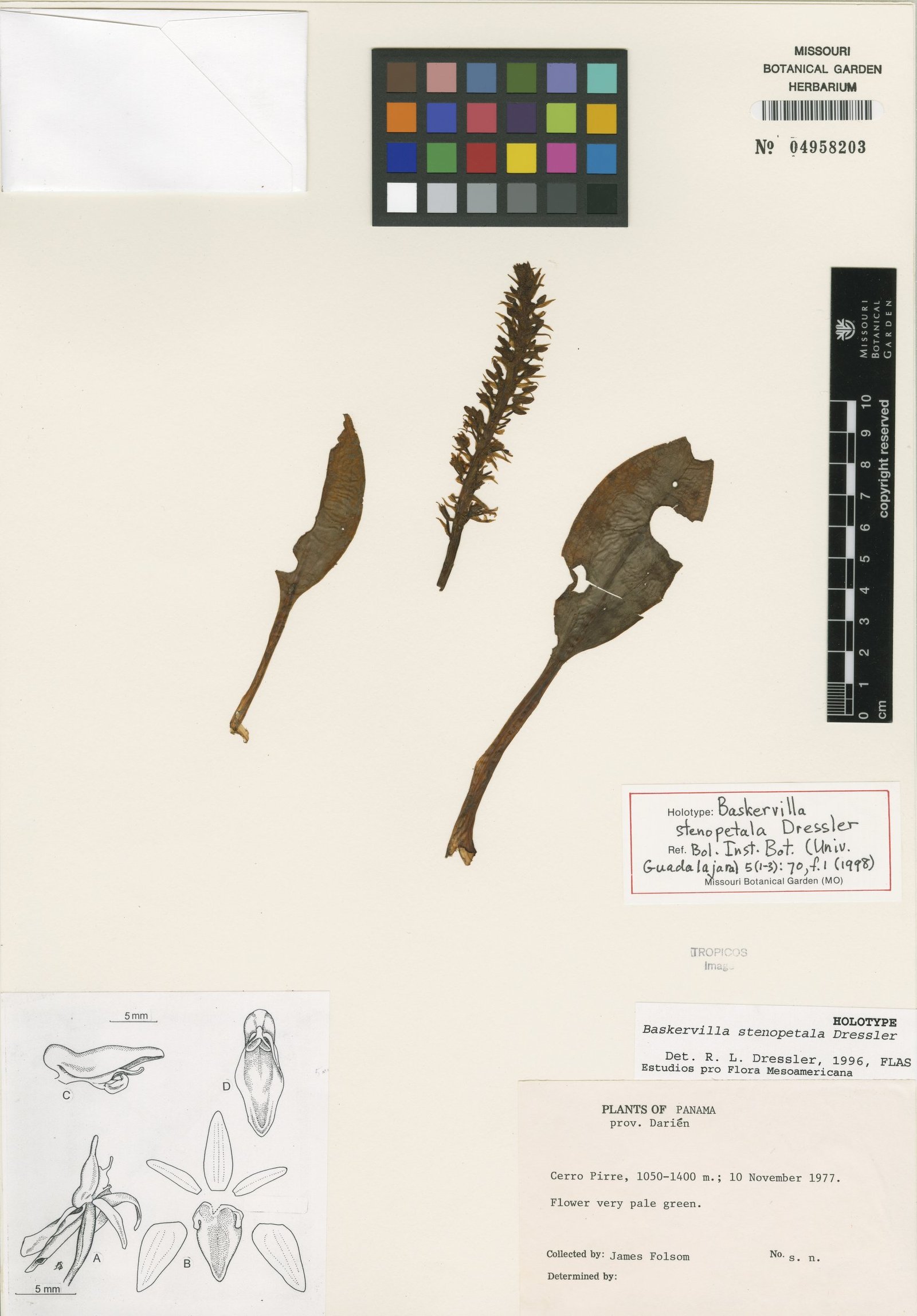 Baskervilla stenopetala Dressler, Bol. Inst. Bot. (Univ. Guadalajara) 5(1-3): 70, f. 1. 1998.