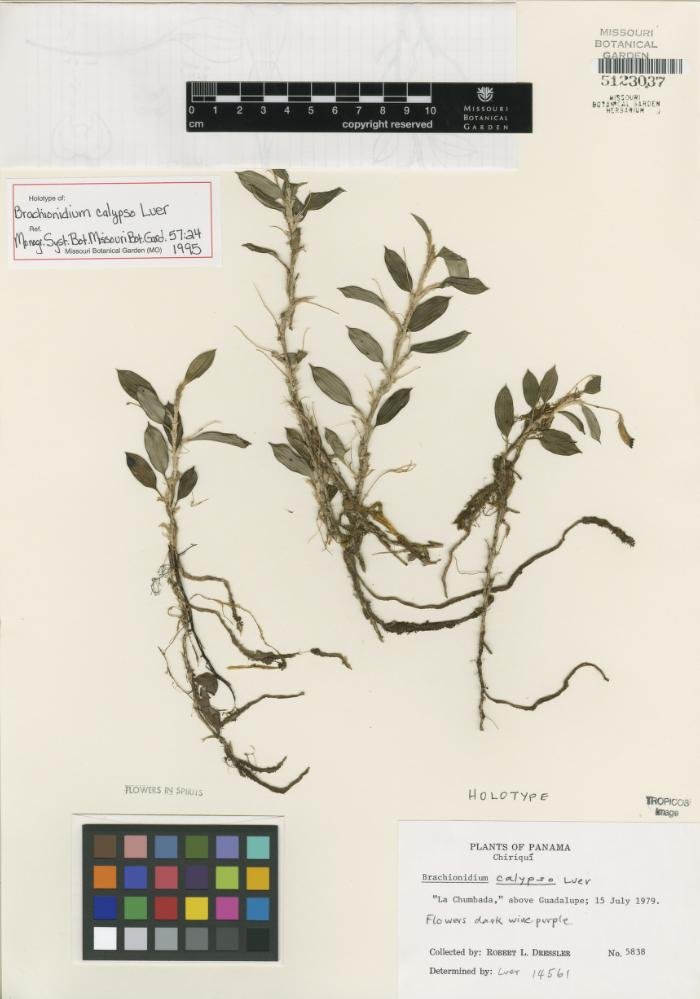 Brachionidium calypso Luer, Monogr. Syst. Bot. Missouri Bot. Gard. 57: 24. 1995.