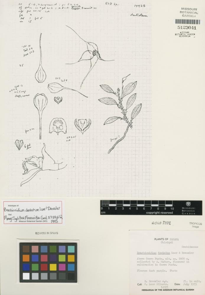 Brachionidium dentatum Luer & Dressler, Monogr. Syst. Bot. Missouri Bot. Gard. 57: 34. 1995.