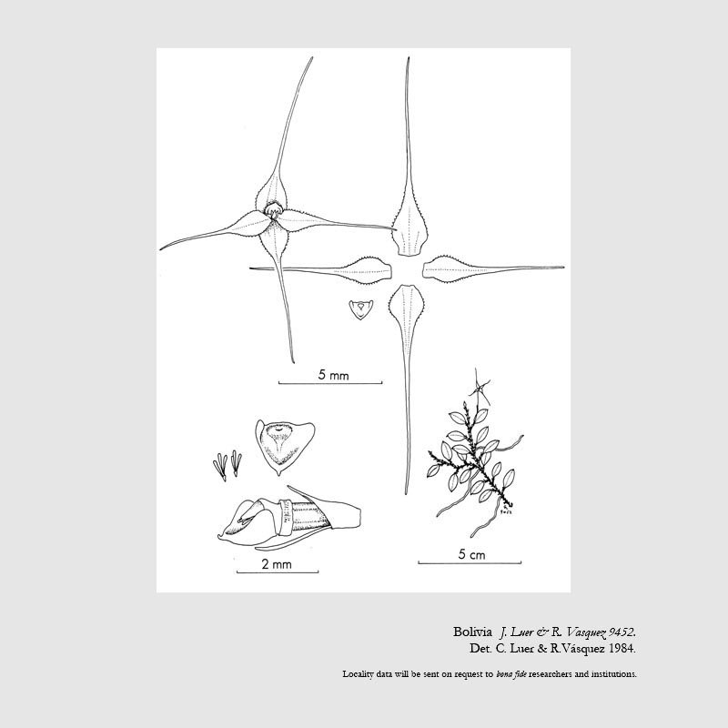 TYPE: Bolivia: Dept. of Cochabamba: Prov. of Chapare: epiphytic in moss in coud forest east of Cochabamba toward Villa Tunari, alt. 1850 m, 29 Jan 1984, C. Luer, J. Luer & R. Vasquez 9452 (holotype, SEL; illustration of type).