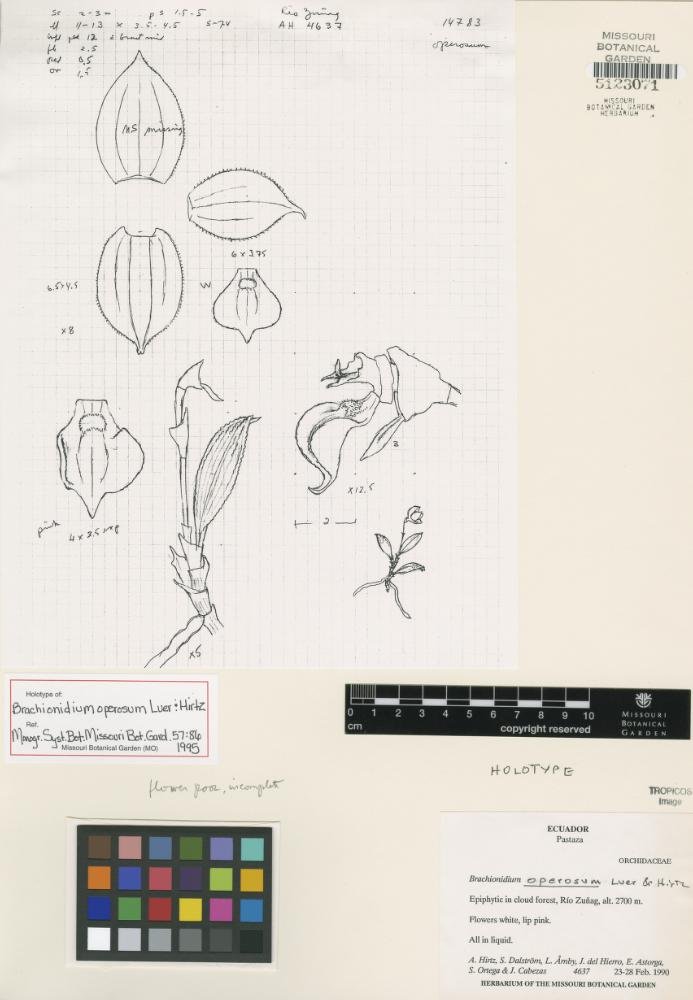 Brachionidium operosum Luer & Hirtz, Monogr. Syst. Bot. Missouri Bot. Gard. 57: 86. 1995.