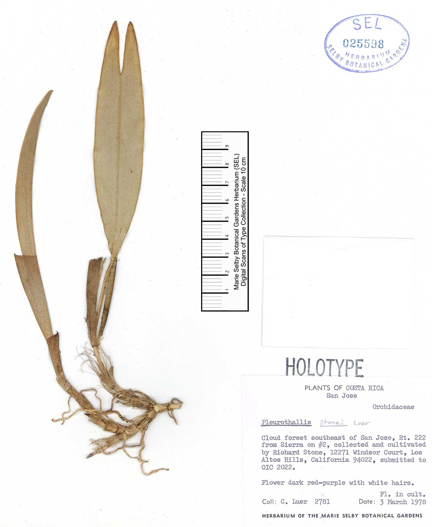 TYPE: San José: epiphytic in cloud forest southeast of San José, collected by R. Stone, flowered in cultivation at Los Altos Hills, CA, 3 Mar 1978, C. Luer 2781 (holotype, SEL).