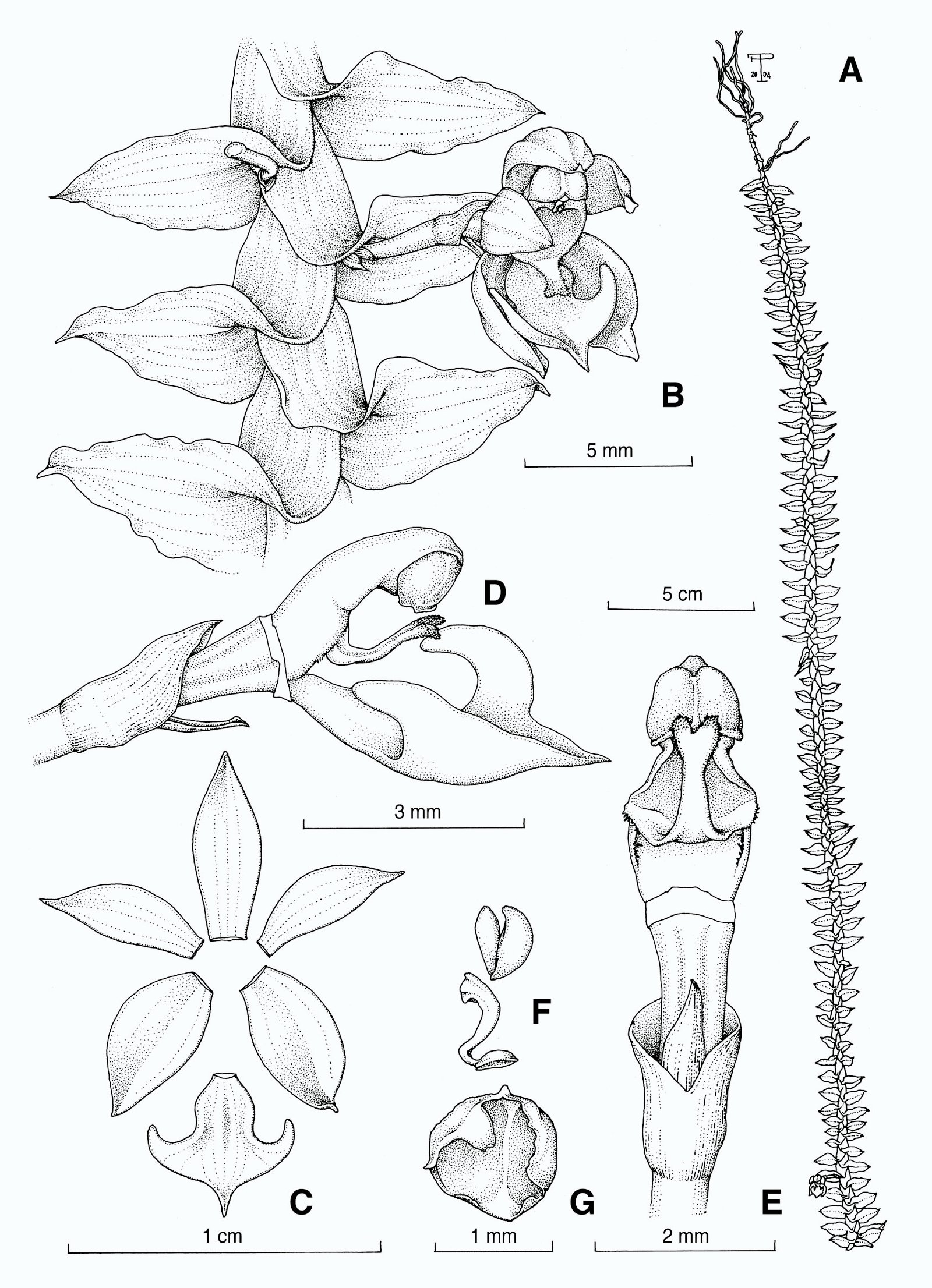 TYPE: Costa Rica. Cartago: Paraíso, Orosi, Tapantí, Parque Nacional Tapantí, El Mirador,9˚44'13.5"N 83˚46'49.6"W, 1376 m, epífita en sitio sombreado en ramitas jovenes de Oreomunnea (Juglandaceae), 24 Agosto 2004,D. Bogarín 925, H. León-Páez & E. Hoppe (holotype, USJ-Spirit; illustration of type).