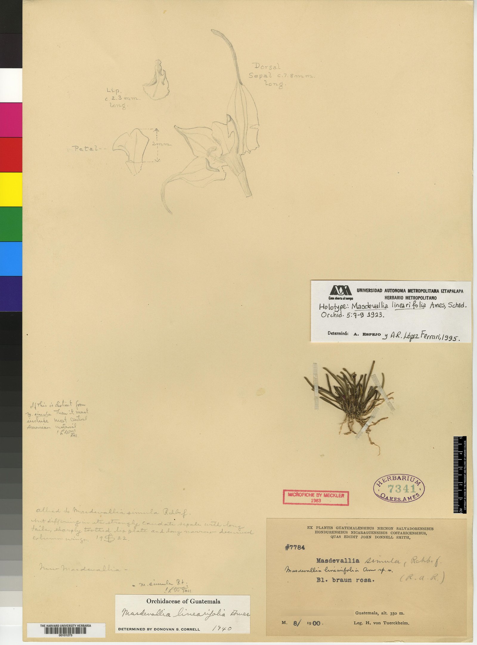 Bas.: Masdevallia linearifolia Ames, Schedul. Orch. 5: 7-9. 1923. TYPE: Guatemala. Alta Verapaz: Cubilquitz, Aug 1900, flowers rose-brown, H. von Tuerckheim 7784 (holotype, AMES).