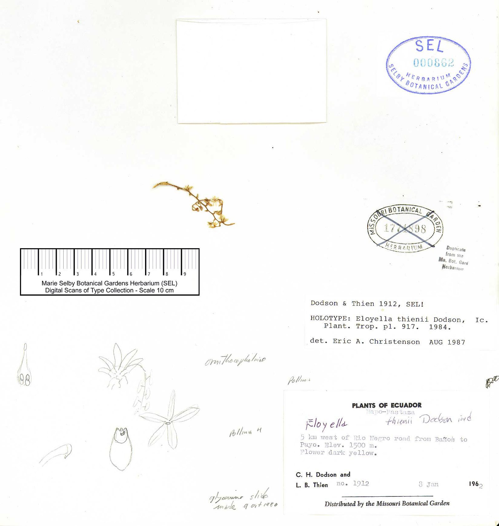 TYPE: Ecuador. Tungurahua: 5 km west of Río Negro, Baños-Puyo, alt. 1500 m, 8 Jan 1962, Dodson & Thien 1912 (holotype, SEL; detail of the holotype, SEL).