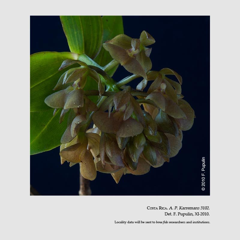 TYPE: Costa Rica. Arbres des paturages, San Pedro de San Ramon, alt. 1050 m, XI. 1921, A. M. Brenes 118 Fleurs vertes-clair violacees (holotype, B, destroyed; neotype designated by Barringer (1986), rejected and designated by Karremans & Hágsater (2010); illustration of type, AMES).