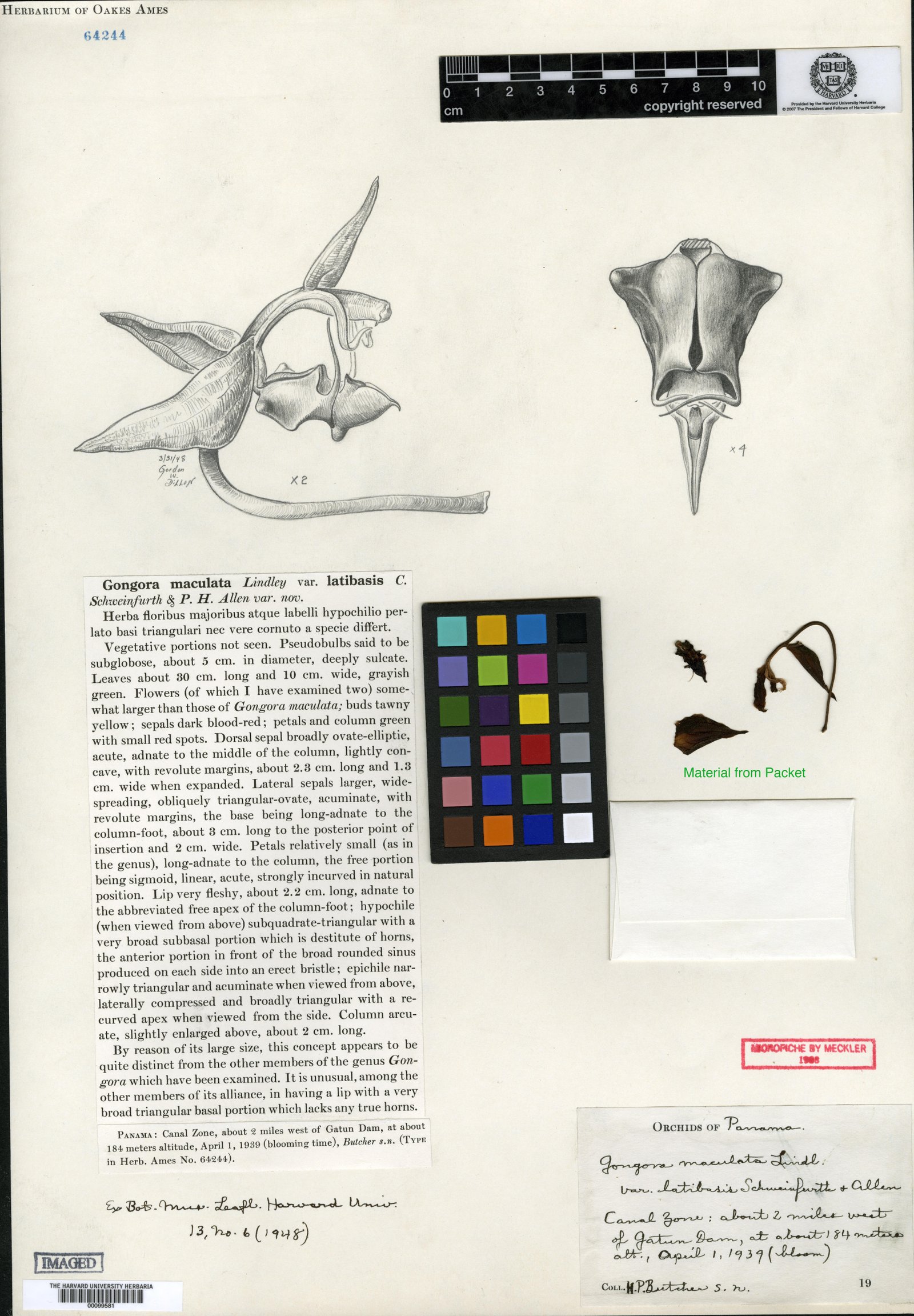 Gongora maculata var. latibasis C. Schweinf. & P.H. Allen, Bot. Mus. Leafl. 13(6): 144. 1948.