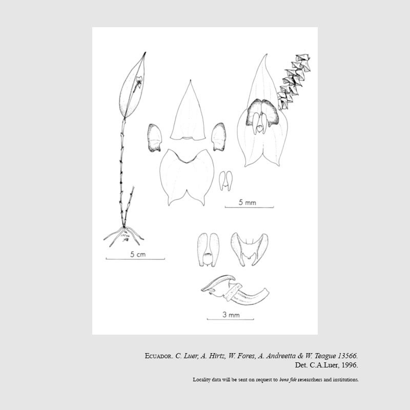 TYPE: Ecuador. Morona-Santiago: Cordillera del Condor, epiphytic in forest east of Guismé, alt. 1750 m, 21 May 1988, C. Luer, A. Hirtz, W. Fores, A. Andreetta & W. Teague 13566 (holotype and drawing of type, MO; illustration of type).