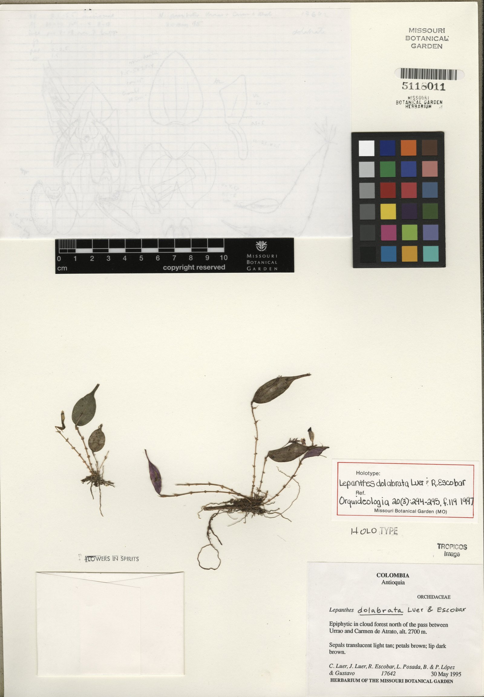 TYPE: Colombia. Dept. of Antioquia, epiphyticin cloud forest north of the pass between Urrao and Carmen de Atrato, alt. 2700 m, 30 May 1995, C. Luer, J. Luer, R. Escobar, L. Moreno de Posada, B. López, F. López & G. Arteaga 17642 (holotype, MO; ilustration of type).