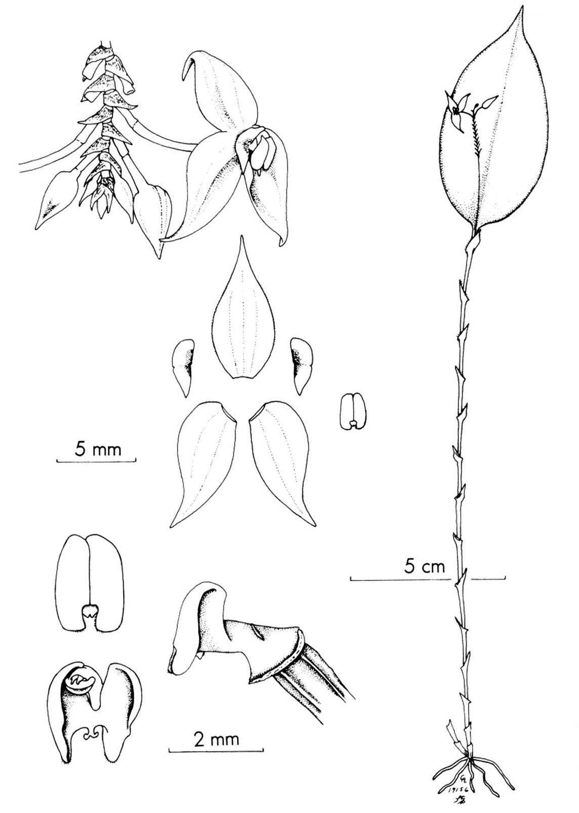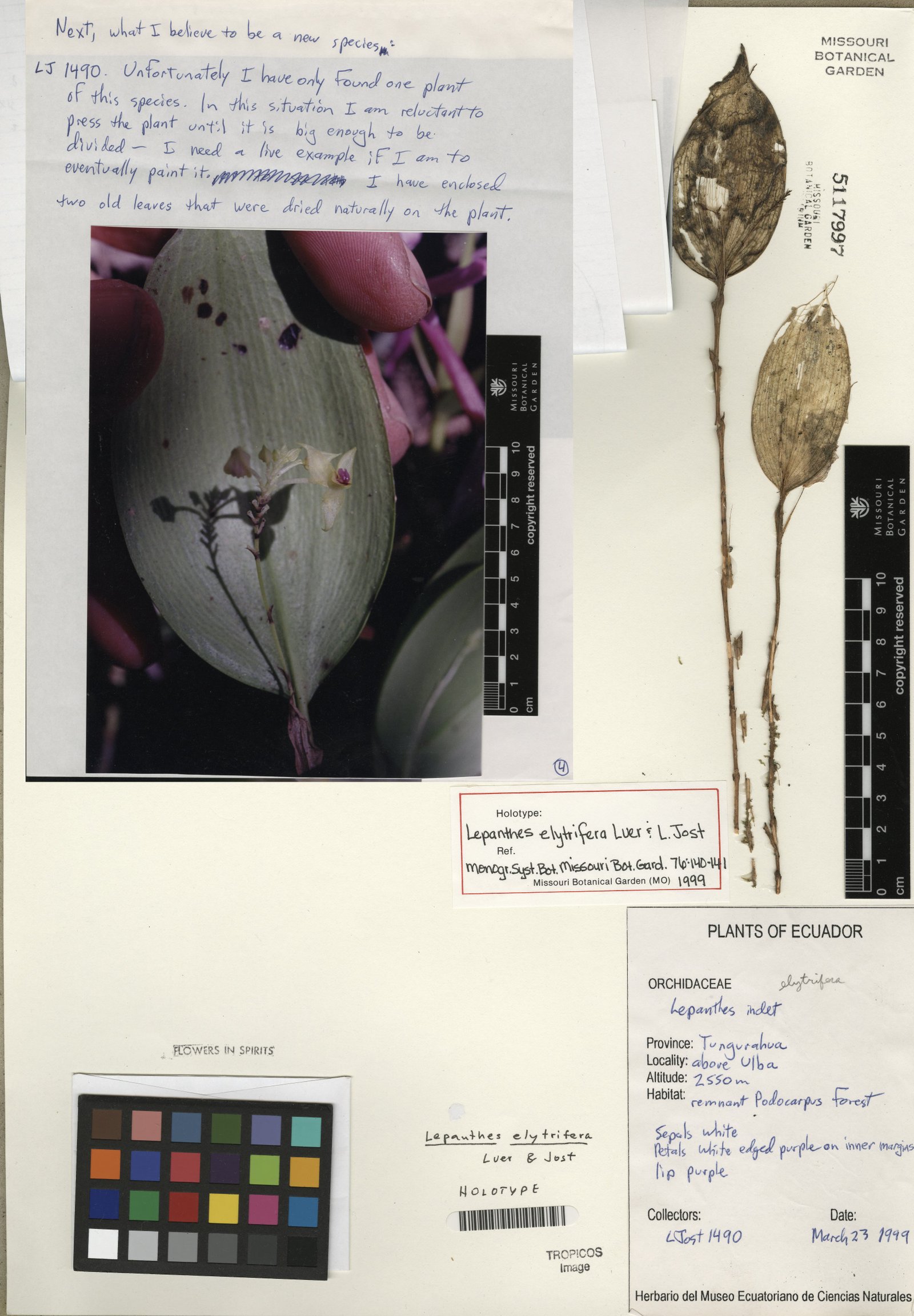 Lepanthes elytrifera Luer & L. Jost, Monogr. Syst. Bot. Missouri Bot. Gard. 76: 140-141, f. 296. 1999.