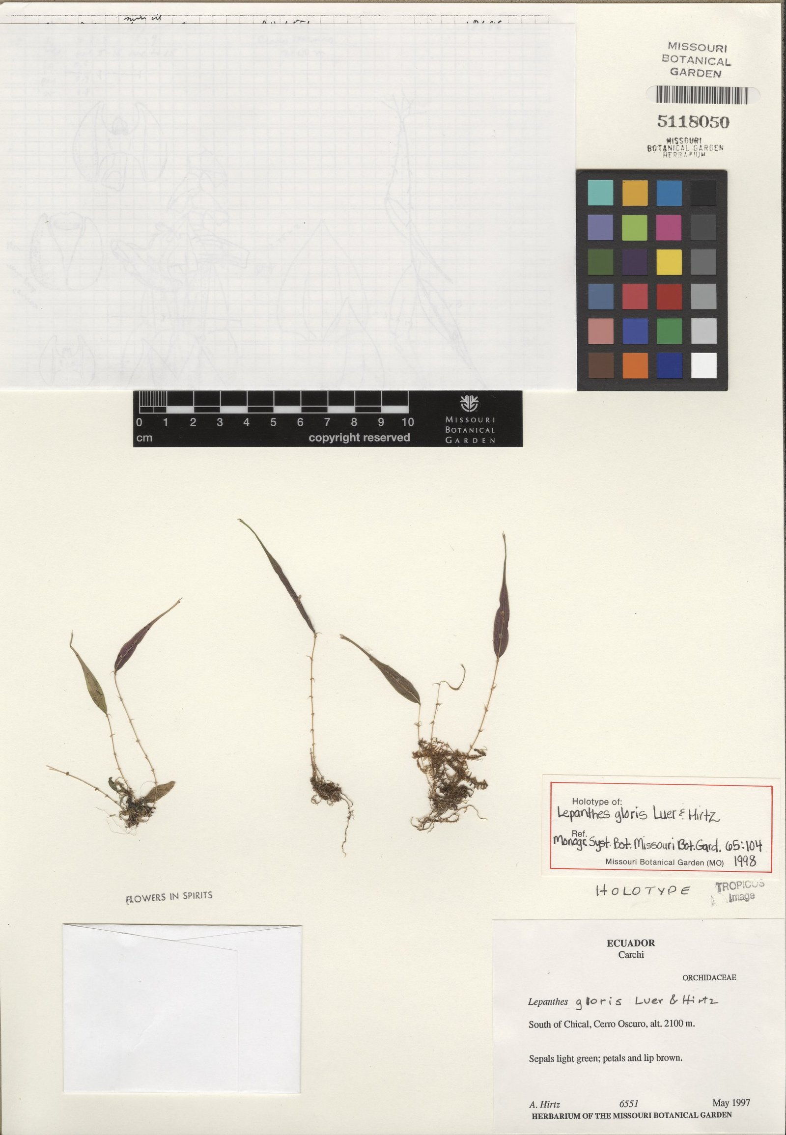 Lepanthes gloris Luer & Hirtz, Monogr. Syst. Bot. Missouri Bot. Gard. 65: 104, f. 272. 1998.