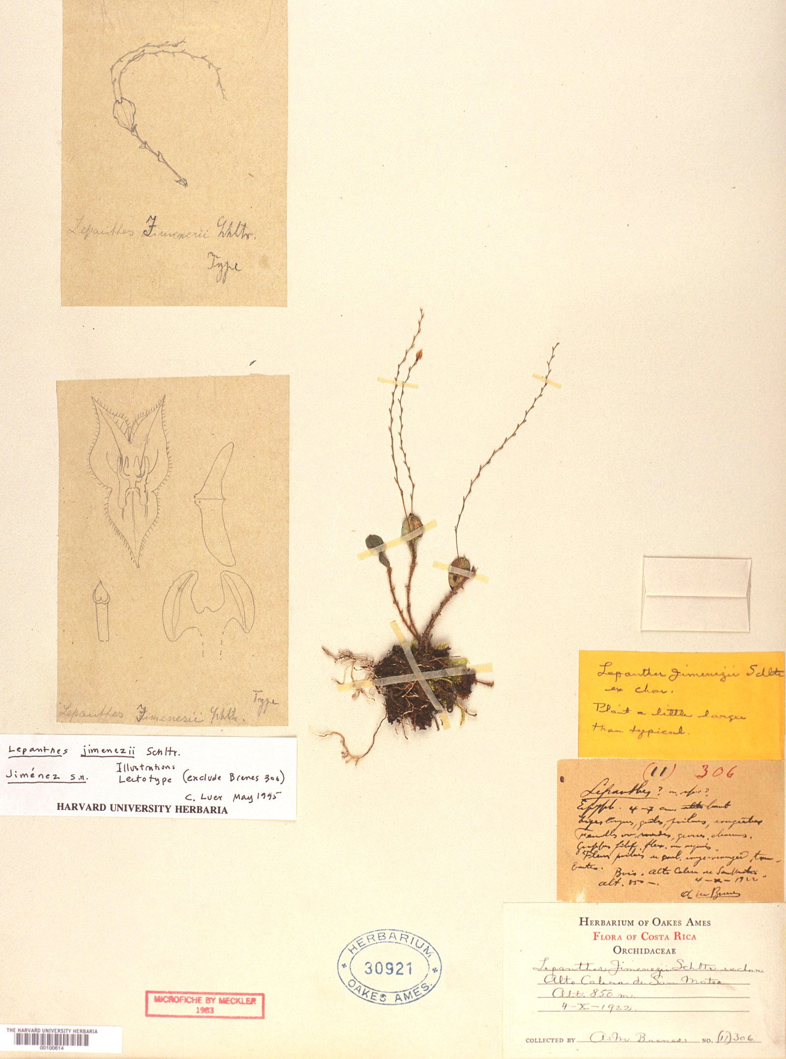 TYPE: Costa Rica. Ohne nahere Standortsangabe, O. Jimenez s.n. (holotype, B, destroyed; selected by C. Luer on the herbarium sheet and designated by Pupulin & Bogarín 2010, tracings of Schlechter's drawing of the holotype, AMES-31565, based on O. Jiménez s.n., excluding the specimen A. Brenes 306 mounted on the same sheet).
