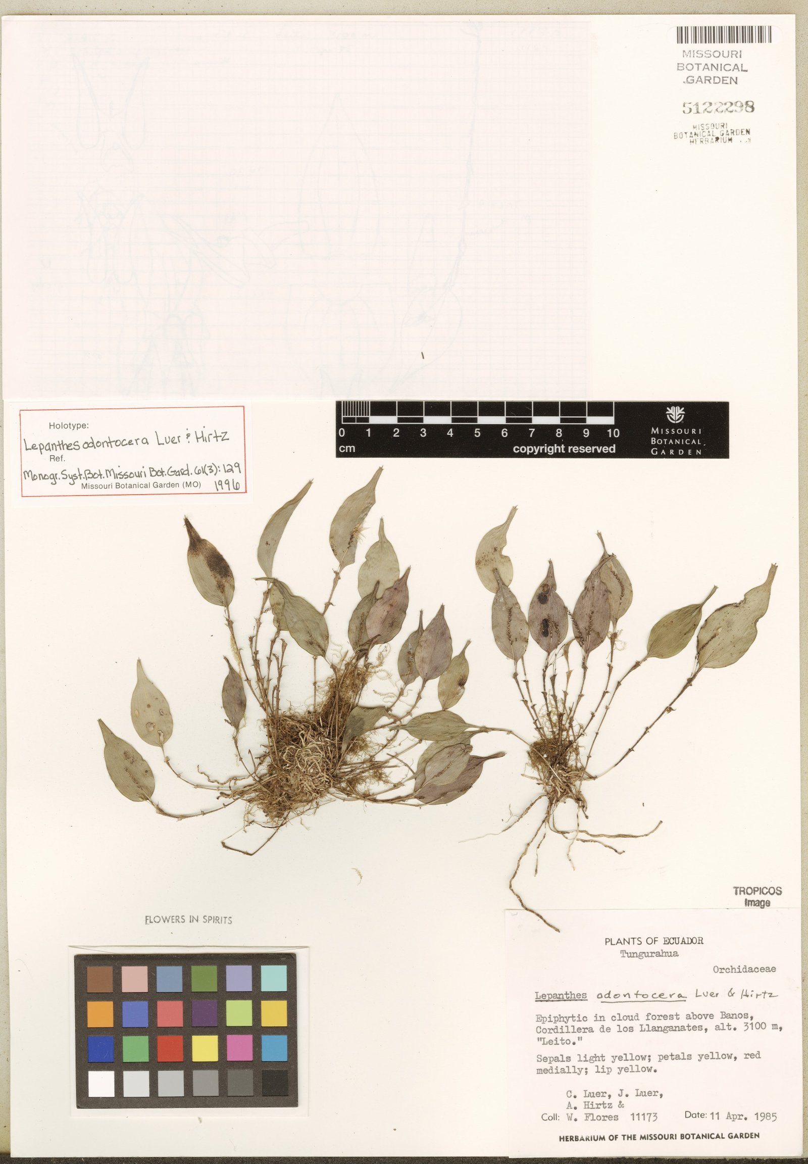 Lepanthes odontocera Luer & Hirtz, Monogr. Syst. Bot. Missouri Bot. Gard. 61(3): 129, f. 170. 1996.