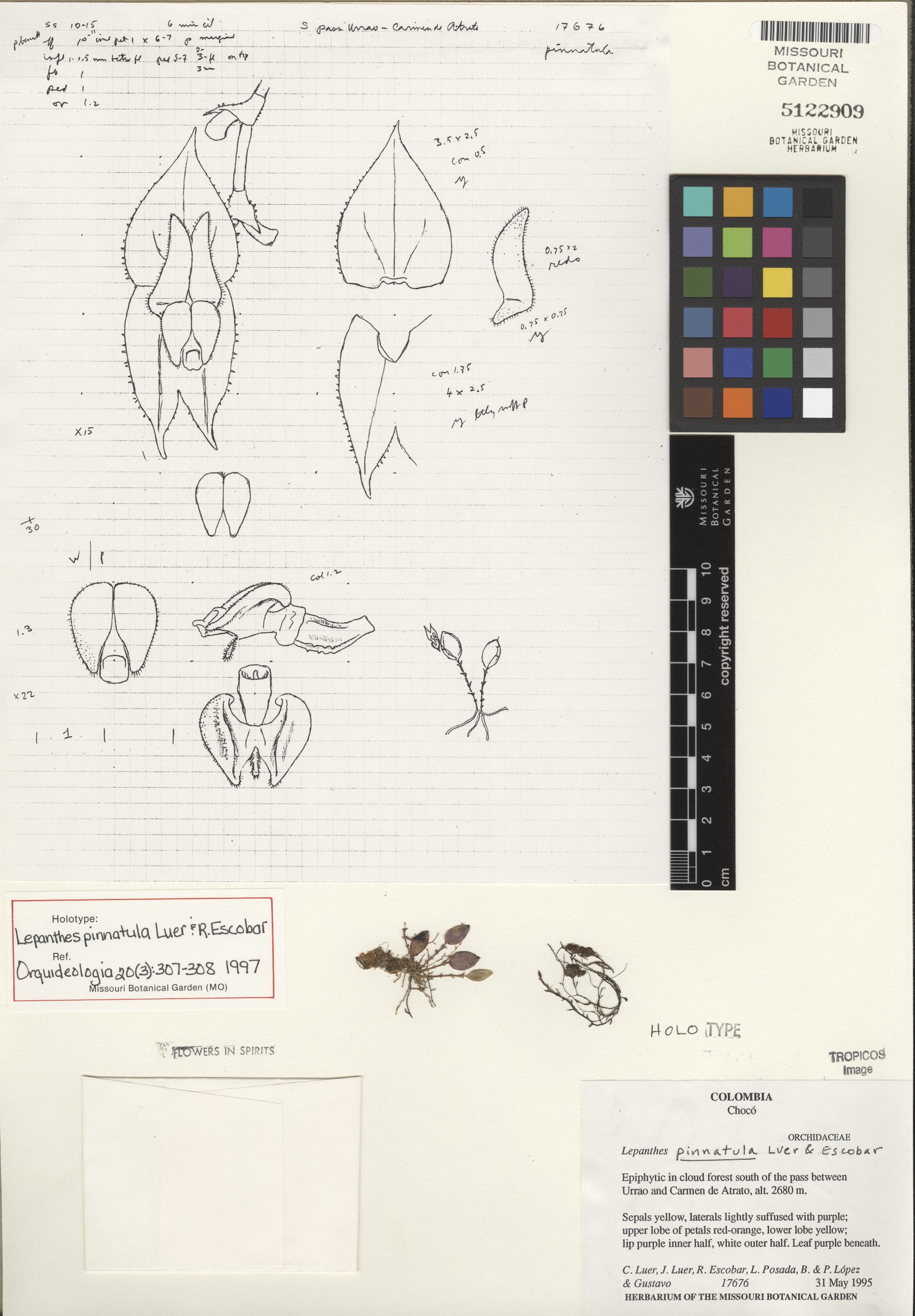 TYPE: Colombia. Dept. of Chocó, epiphytic in cloud forest south of the pass between Urrao and Carmen de Atrato, alt. 2680 m, 31 May 1995, C. Luer, J. Luer, R. Escobar, L. Moreno de Posada, B. López, F. López & G. Arteaga 17676 (holotype, MO; ilustration of type).