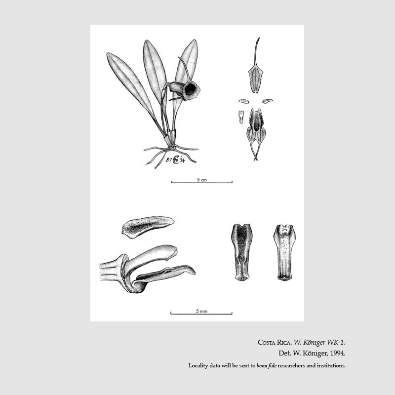 TYPE: Costa Rica. Ohne genauren Fundort, seit ca. 10 Jahren in Kultur in München, W. Königer WK-1 (holotype, M; isotypes, K, herb. Königer; clonotype, MO; illustration of type; drawing of the clonotype, MO).