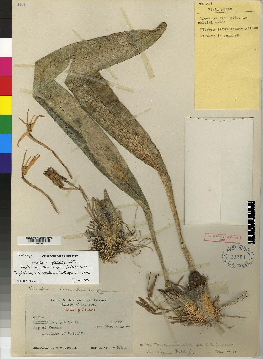 Maxillaria pubilabia Schltr., Repert. Spec. Nov. Regni Veg. Beih. 17: 71–72. 1922.