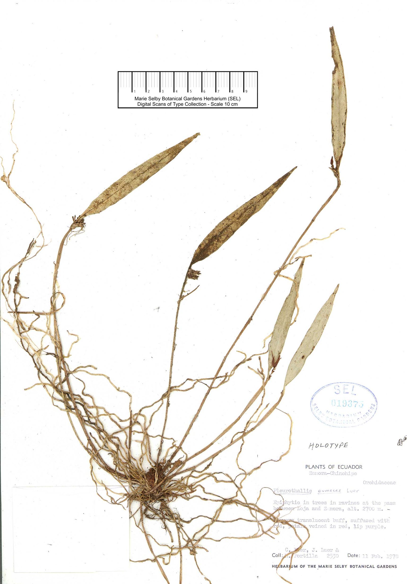 TYPE: Ecuador. Zamora-Chinchipe: epiphytic in cloud forest at the pass between Loja and Zamora, alt. 2700 m, 11 Feb. 1978, C. Luer, J. Luer & M. Portilla 2530 (holotype, SEL).