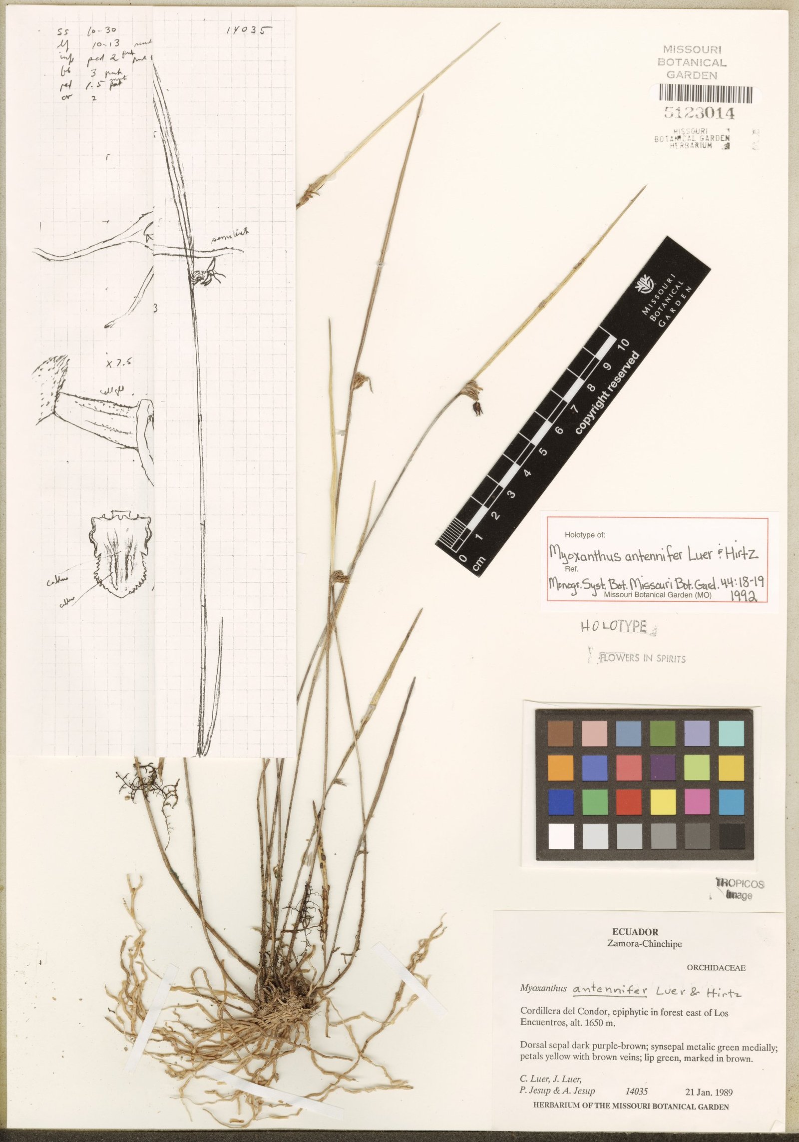 Myoxanthus antennifer Luer & Hirtz, Monogr. Syst. Bot. Missouri Bot. Gard. 44: 18-19, pl. 3. 1992.