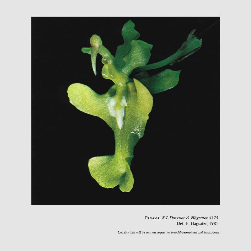 TYPE: Panama. Veraguas: Cerro Tute, Dec 1975. Preparado de material cultivado, 1 Oct 1980, R.L Dressler & Hágsater 4173 (holotype, AMO; isotype, MO; photo of the flower of the plant that served as the holotype).