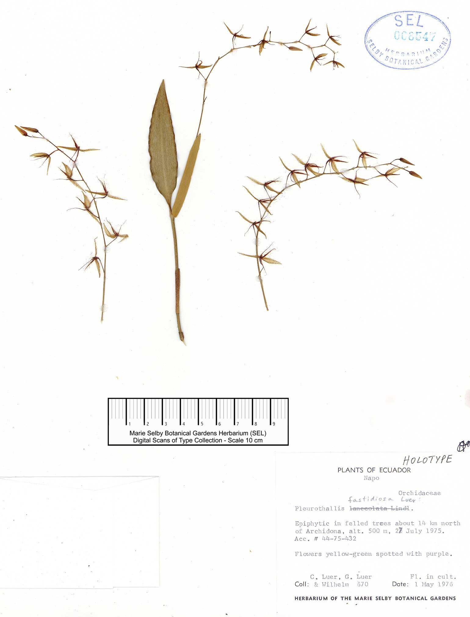 TYPE: Ecuador. Napo: epiphytic in felled trees ca. 14 km north of Archidona, alt. ca. 500 m, 27 July 1975, C. Luer, G. Luer & S. Wilhelm 670 (holotype, SEL; illustration of type).