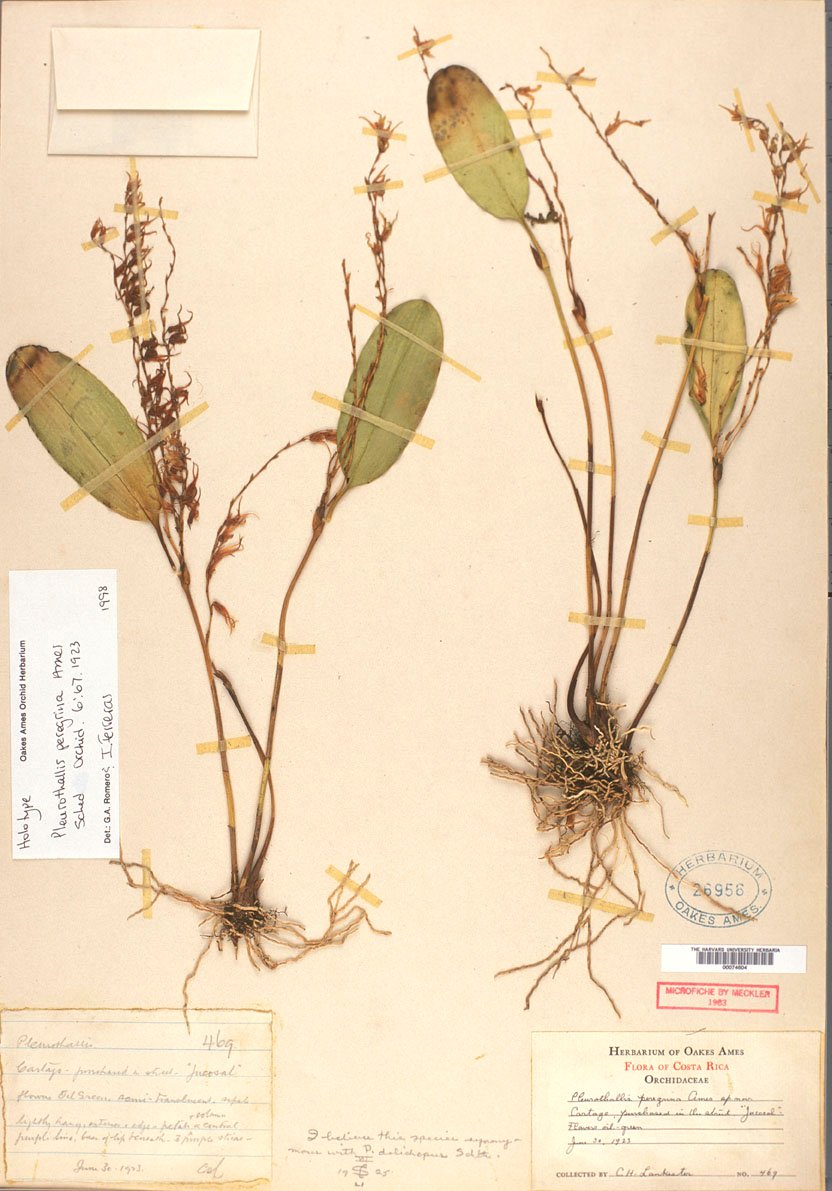 TYPE: Costa Rica. Jucosal. Purchased in Cartago from native. June 30, 1923. “Flowers olive-green, semitranslucent, sepals lightly hairy, petals and column with central purple line; base of lip with three purple striae.” C.H. Lankester 469 (holotype, AMES; detail of type, AMES; illsutration of type, AMES).