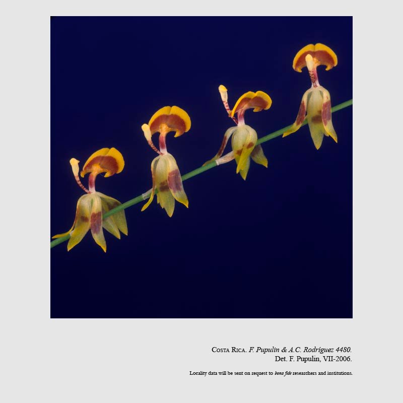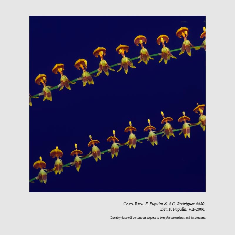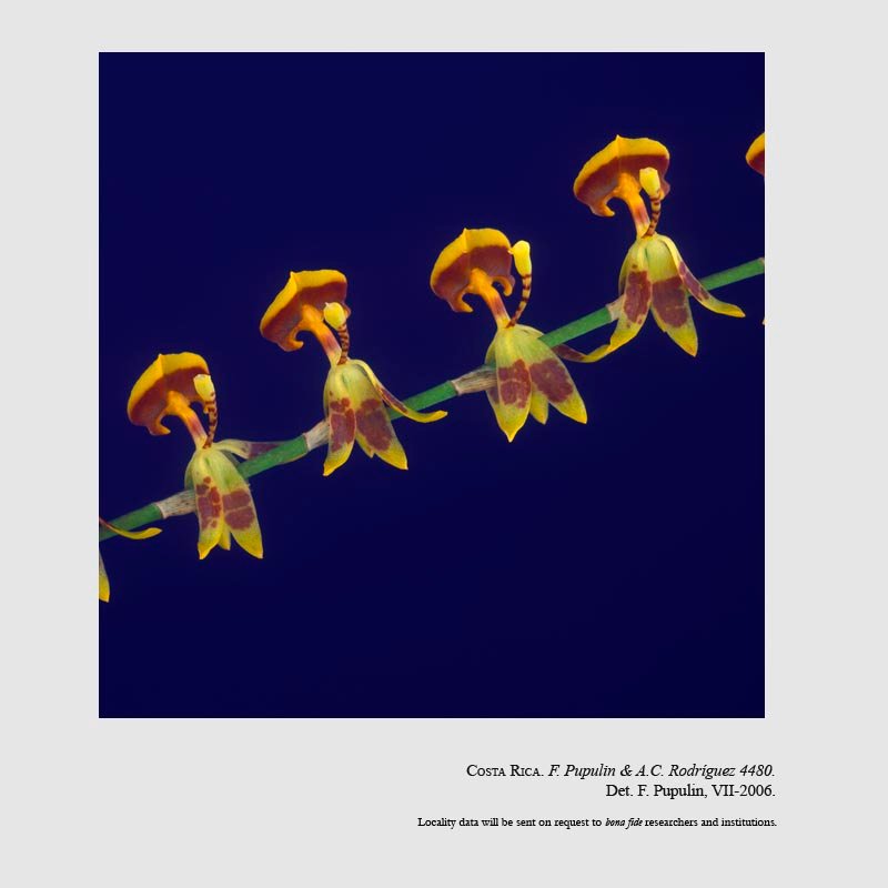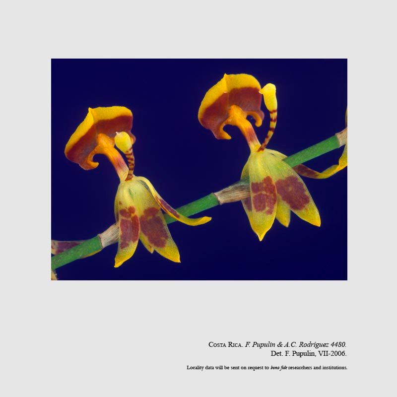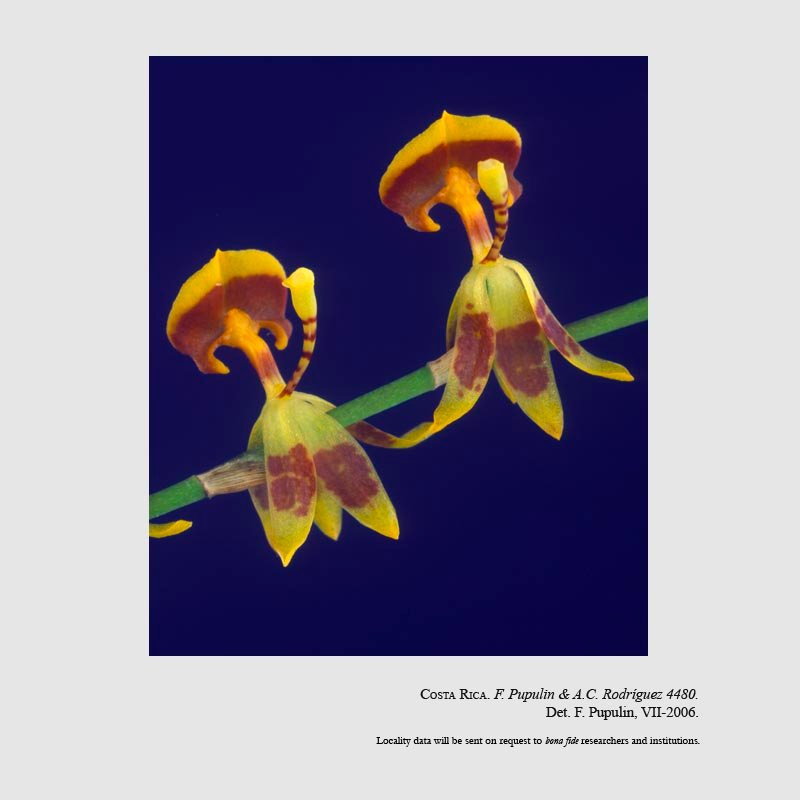TYPE: Costa Rica. Puntarenas: Coto Brus, Zona Protectora La Tablas, Las Alturas de Cotón, trail from Las Alturas Biological Station to Cerro Echandi, 08º56'59"N 82º50'02"W-08º50'30"N 82º59'50"W, 1620-1850 m, lower montane moist forest, 21 Mar 2003, flowered in cultivation at Jardín Botánico Lankester, 1 Jun 2005, F. Pupulin & A.C. Rodríguez 4480 (holotype, CR; isotype, JBL-spirit).