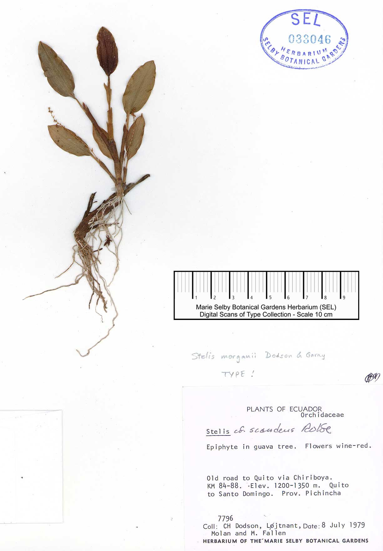 TYPE: Ecuador. Pichincha: Dos Ríos, km 87 old road Quito-Santo Domingo, alt. 1200 m, flowered in cultivation, 10 May 1980, Dodson, Morgan, Lojtnant & Molau 7796 (holotype, SEL).