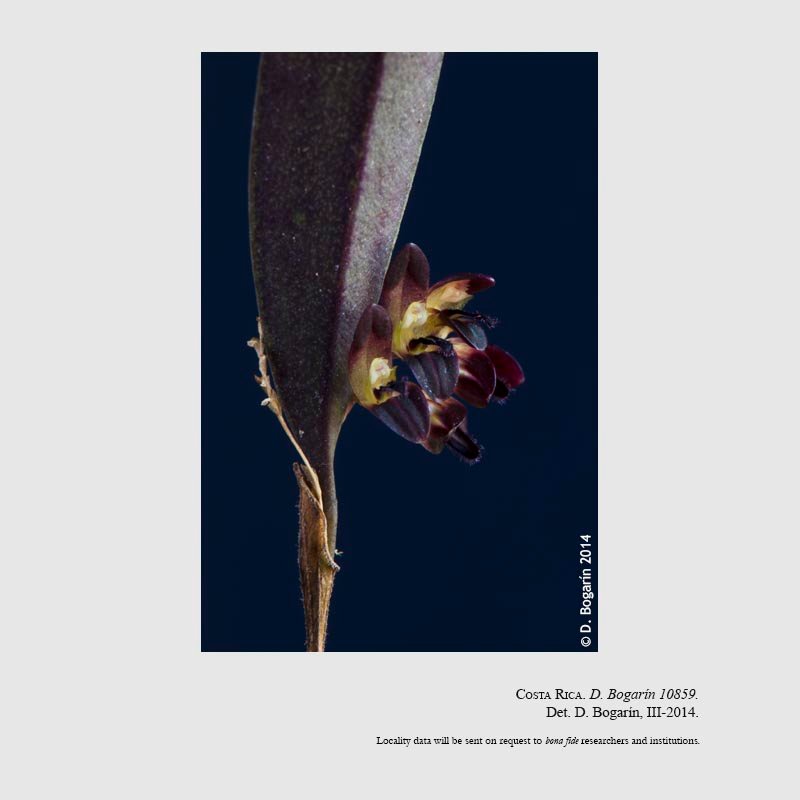 TYPE: Costa Rica. Guanacaste: Nicoya, San Antonio, Barra Honda National Park, Ceiba trail, area of Las Cascadas, 10º11'15"N 85º20'36.1"W, 210 m, basal transition to premontane wet forest, epiphytes in fallen Ficus sp. (Moraceae) tree, 11 July 2005, D. Bogarín 1674 & F. Paniagua (holotype JBL, isotype CR; illustration of type).
